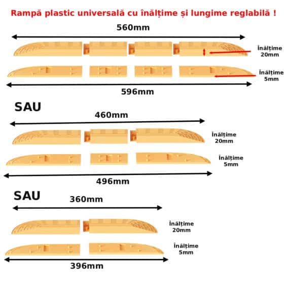 Rampa modulara din plastic, usor de asamblat, cu inaltime setabila de la 20 mm la 25 mmsi lungime configurabila in 6 variante: 360 / 396 / 460 / 496 / 560 / 596 mm. Solutie discreta pentru trecerea peste praguri joase (ex. roboti de aspirare, carucioare usoare).