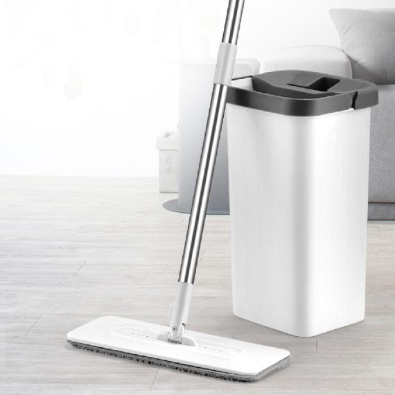 Set mop cu galeata PAA-home®, mop plat din microfibra, cuve separate pentru spalare si uscare, 2 lavete pentru mop incluse, orificiu scurgere apa, capacitate 3.2 Litri culoare alba