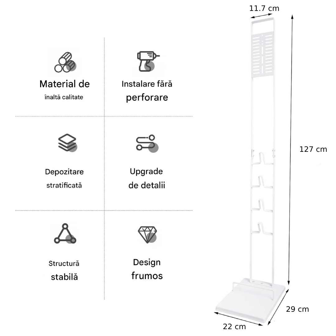Fabricat din materiale durabile, precum metalul sau plasticul de inalta calitate, asigurand o rezistenta pe termen lung si o sustinere sigura pentru accesoriile Dyson. Suportul poate fi atasat direct pe podea, fie in bucatarie, baie, sufragerie sau alte incaperi in care utilizarea produselor Dyson este frecventa.